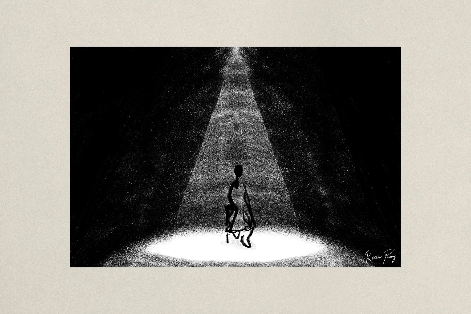 La mise en scène, minimaliste, suit ma direction d’émotion : un puits de lumière sur la mannequin, entourée d’un bleu troublé.